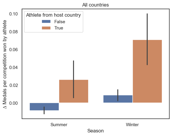 But hosting the Olympics is quite an expensive endeavor, hosting countries must be commited to the sport, this could also mean they spend more on athletic development or are economically better off than non-hosting countries. How should we countrol for this? I decided to calculate the difference in the share of medals per competition a country won between a given year and the previous Olympics. This difference should be roughly 0 if there is no home advantage. The figure below shows that non-hosting countries actually earned a similar amount of medals per competition and athlete in any two consecutive Olympics, but hosting countries earned more (though this difference is insignificant).